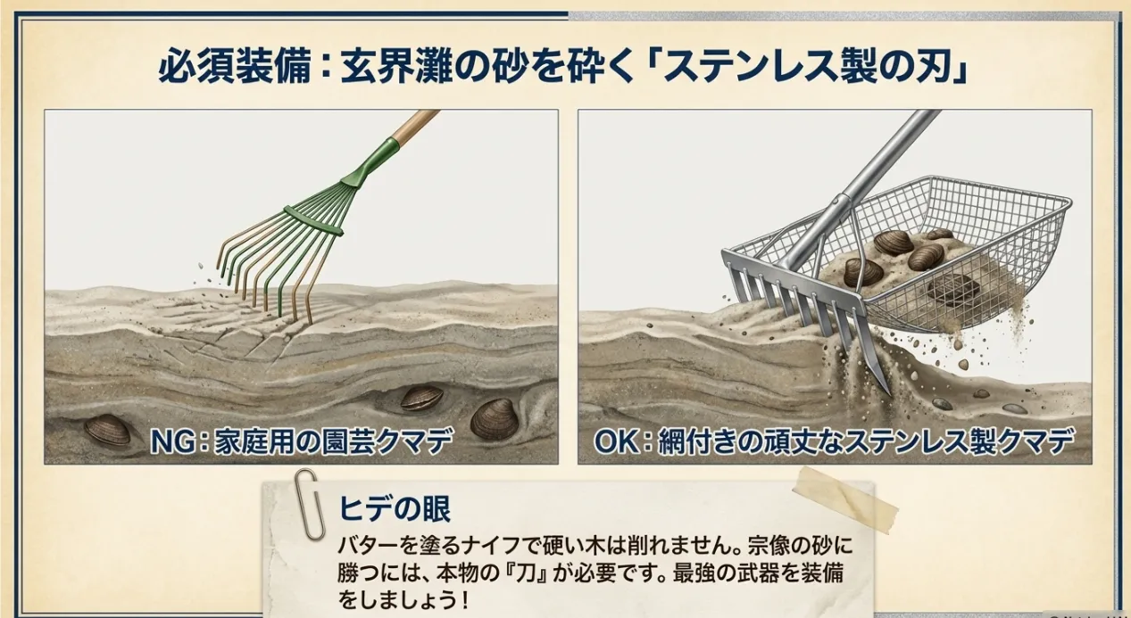 宗像の「硬く締まった砂」を攻略するには、一般的な園芸用の熊手では歯が立ちません。爪が鋭く、かつ強い力がかかっても曲がらないステンレス製の道具が必須です。現地での「獲れる・捗る」を基準に、僕が厳選したアイテムを比較表にまとめました。