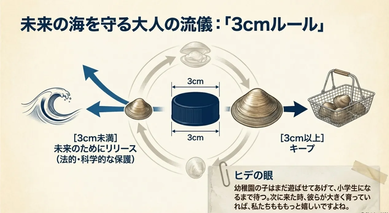 宗像での遊びには、一つの大切な約束があります。それは「殻長3cm以下の貝は採らない」というルール。これは福岡県漁業調整規則でも定められている法的ルールですが、それ以上に「海の恩恵を未来に繋ぐ」ための大切なマナーです。3cmという数字がピンとこない時は、ペットボトルのキャップを思い出してください。キャップより小さいものは、迷わず海へ戻してあげましょう。