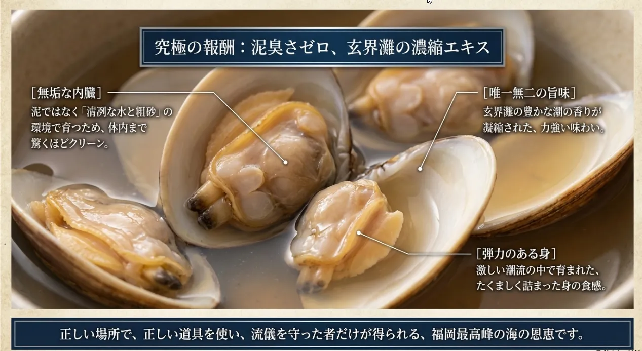 玄界灘の荒波で締まった砂の下に、大粒のアサリが踏ん張っています。この独自のフィールド特性を理解すれば、初心者家族でも「本物の天然物」を手にできますよ。