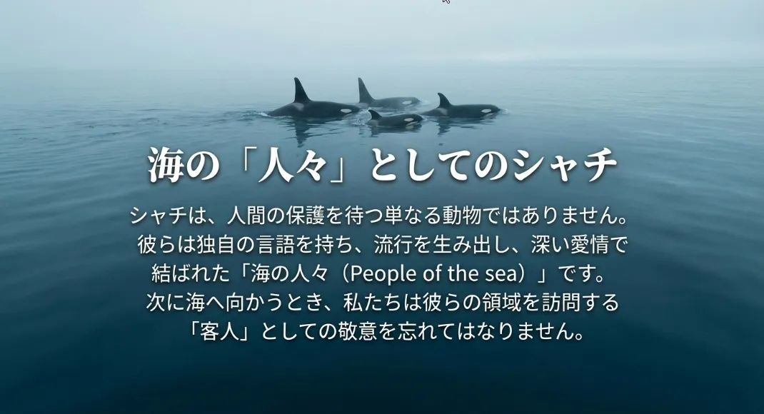 ベテランの観察者は、シャチが近づくとソナーをオフにします。静寂を贈ることで、シャチたちが安心して自分たちの対話を再開できるよう配慮する。