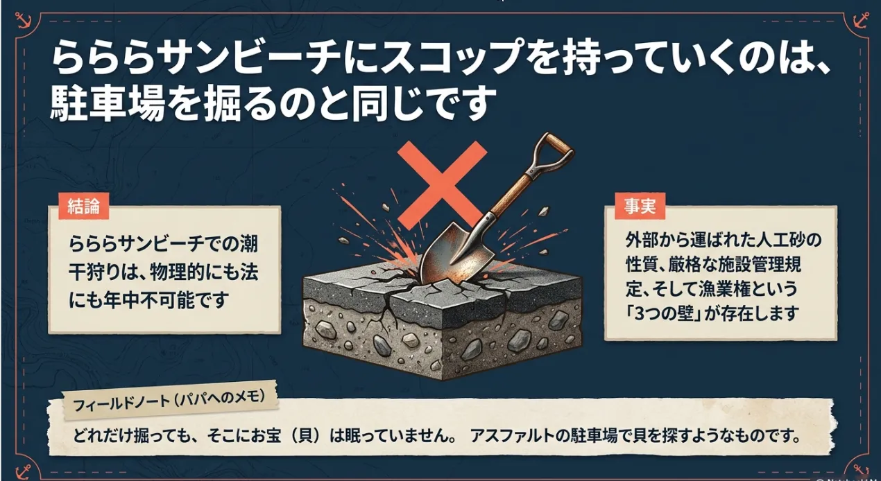 期待して重い熊手やバケツを持っていっても、入り口で注意されたり、そもそも砂が掘れなかったりと、パパの努力が空回りしてしまうリスクがあるんですね。なぜここまで「できない」と言い切れるのか、その「動かぬ証拠」を、海のプロとしての視点から優しく噛み砕いてお話ししますね。