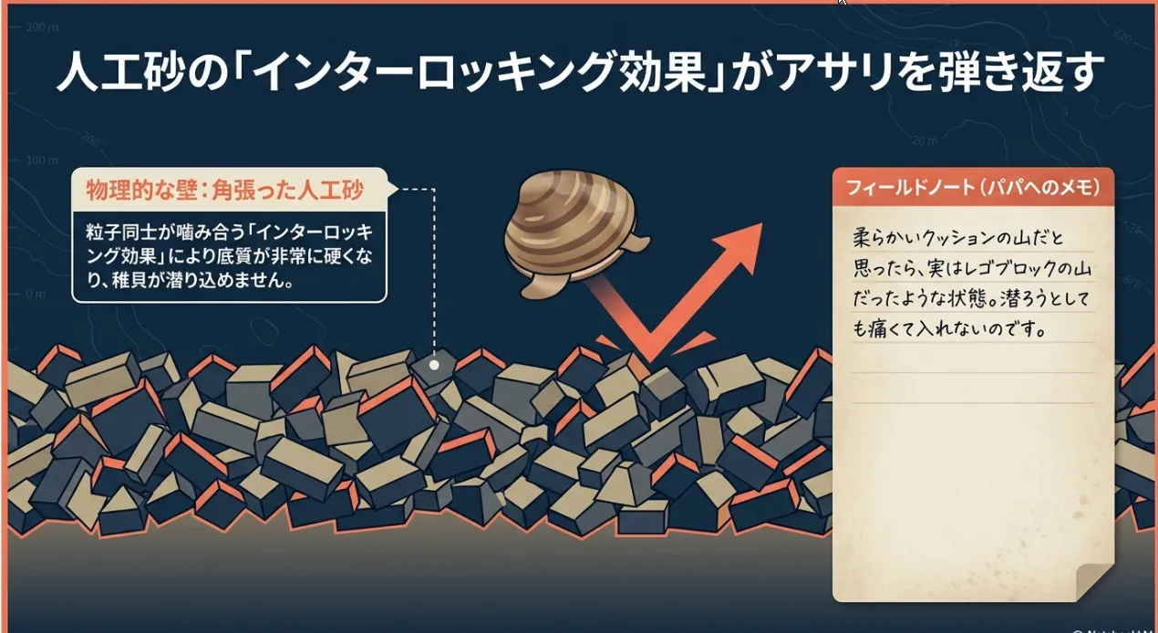 天然の砂浜の砂は波で洗われて丸みを帯びていますが、ここの人工砂は一粒一粒が角張っています。これが堆積すると、粒子同士が噛み合ってガチガチに固まってしまうんです。これを専門用語で「インターロッキング効果」と言いますが、簡単に言えば「貝が潜ろうとしても、砂が硬すぎて跳ね返されてしまう」ということ。柔らかい足を持つ稚貝が砂の中に潜り込めないため、アサリが育つ環境が物理的に存在しないんです。
