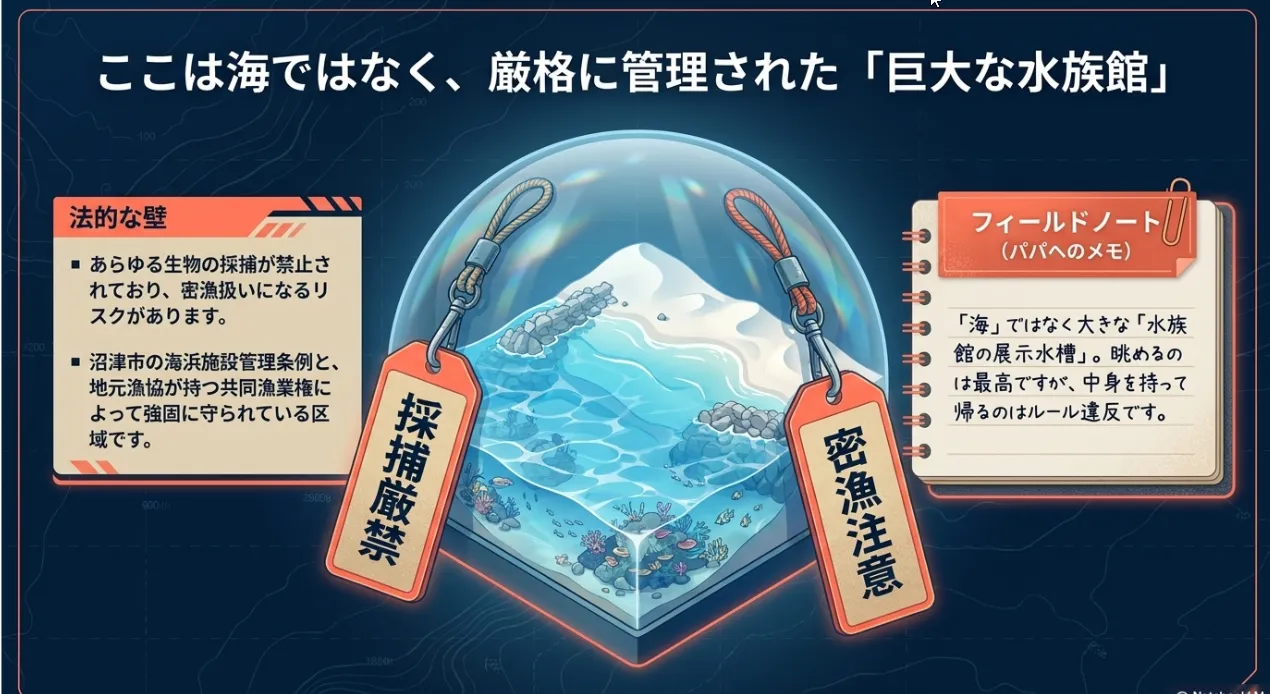 次に、法律やルールの壁です。らららサンビーチは単なる自然の海岸ではなく、沼津市が管理する「海浜施設」です。施設の利用規則では、生物の持ち出し(採捕)が明確に禁止されています。