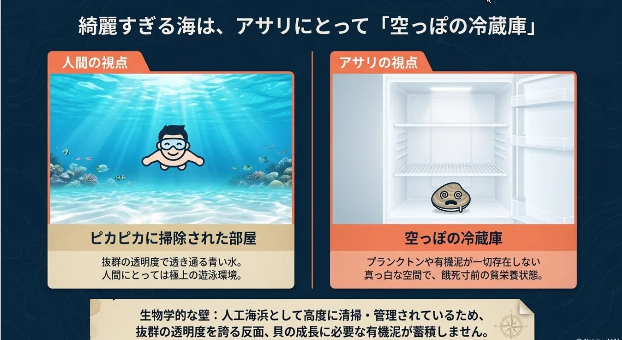アサリなどの二枚貝は、海水の中のプランクトンや泥に含まれる有機物を食べて生きています。らららサンビーチは強力な防波堤で囲まれ、波が穏やかな上に定期的に清掃・整備されているため、水が透き通って非常に清潔です。しかし、これは貝にとっては「食べ物がない」状態。貧栄養な環境に加え、砂の入れ替え作業で生態系がリセットされるため、アサリが繁殖し続けるのは生態学的に見て極めて困難なんです。