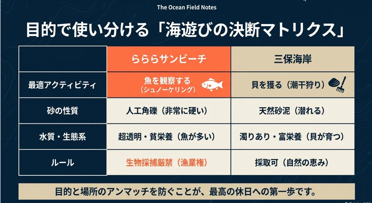 「らららサンビーチで潮干狩り」という言葉に隠された真実、お届けできたでしょうか。ここは貝を収穫する場所ではありませんが、その代わり、日本有数の「美しくて安全な海」を家族に体験させてあげられる最高の場所です。