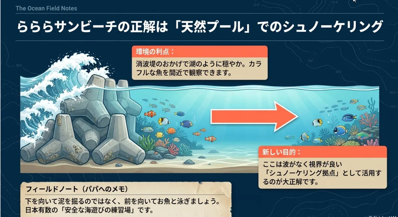 人工的に整備された「磯浜エリア」は、足場も安定しているので子供のシュノーケリングデビューにはこれ以上ない舞台です。貝を「獲る」のではなく、生きている姿を「観察する」楽しさを教えてあげる。これこそが、このビーチの正しい使いこなし方ですよ。