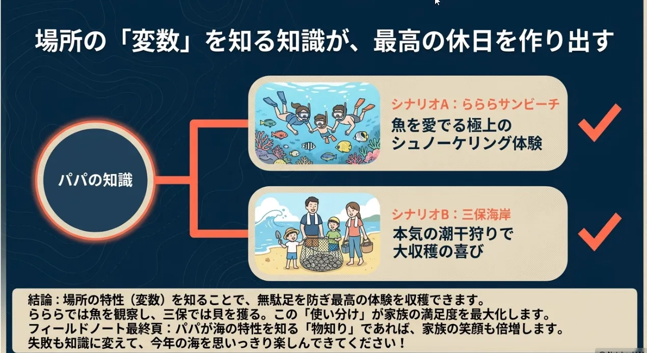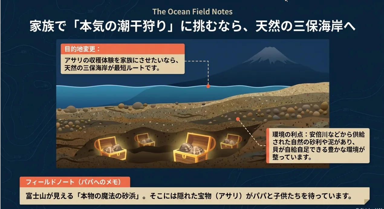 ネットの曖昧な情報に振り回されて、当日現地で困ってしまうパパが一人でも減ることを願っています。「ここでは貝は採れないけれど、お魚と一緒に泳げるんだよ」と子供に伝え、「明日は三保海岸で本物の貝を採ろうか」と次の約束をする。そんなスマートなパパの振る舞いが、家族にとって一番の思い出になるはずです。
