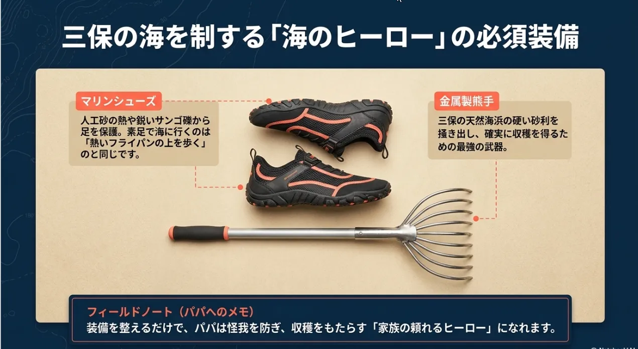 僕が選ぶなら、まずはマリンシューズですね。これ一つあるだけで、磯遊びの「攻められる範囲」が劇的に広がります。三保海岸で本格的に掘るなら、100均の熊手ではすぐに曲がってしまうので、鉄製のしっかりした忍者熊手を選んでください。
