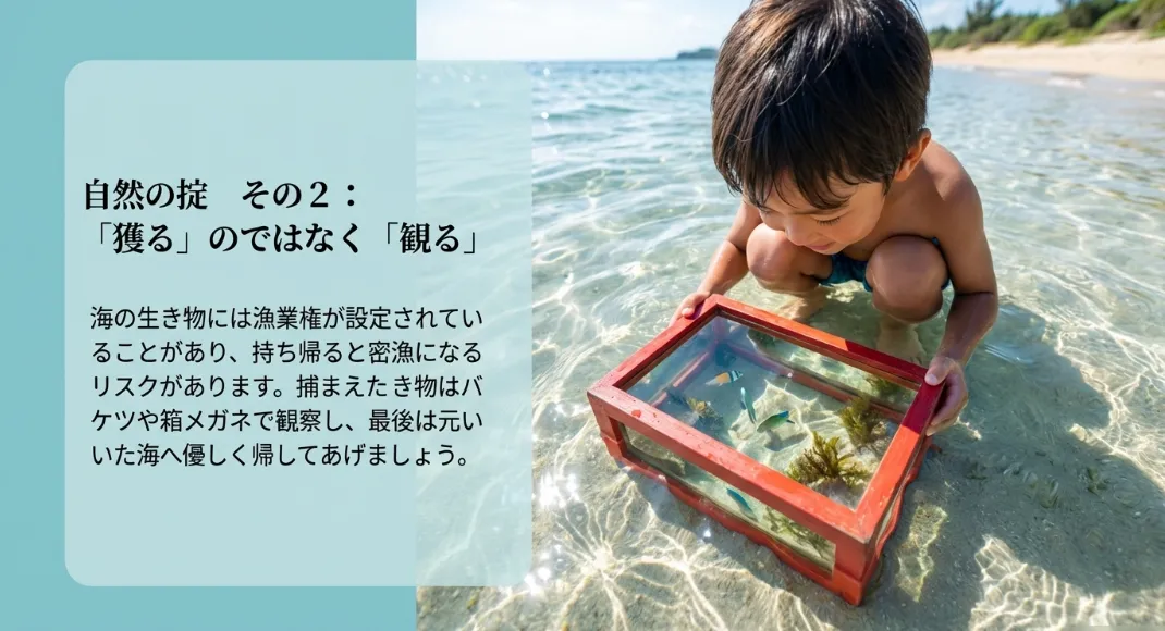 大潮は海が僕たちを招待してくれる特別な日ですが、そこは彼ら生き物たちの「家」であることを忘れてはいけません。僕たちが楽しく遊び続けるために、守るべきスマートな作法が2つあります。