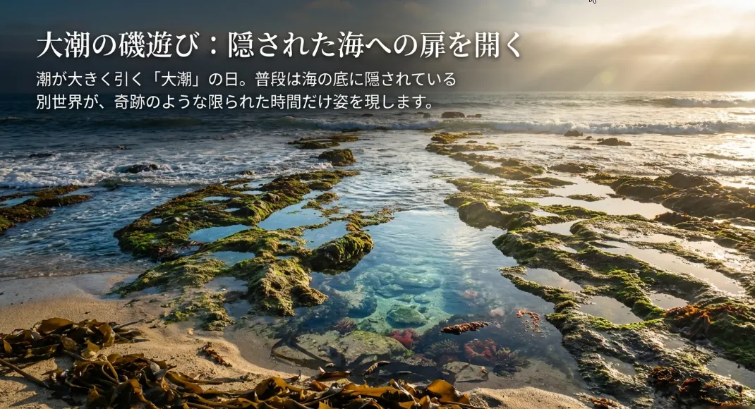 磯遊びにおいて、大潮というタイミングはまさに「魔法」です。月と太陽の引力が重なり、潮の満ち引きが最大になるこの時期は、普段は波に洗われている岩場が広大な遊び場へと変貌します。