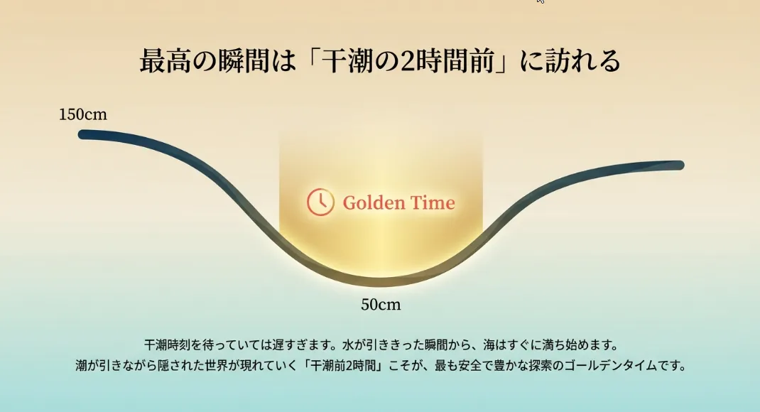 潮が最も引く「最干潮」の前後2時間は、普段は海の下に隠れている生き物たちに出会える唯一のチャンスです。この4時間に全集中することで、磯遊びの楽しさは何倍にも膨れ上がりますよ。