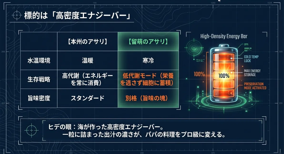 温かい海のアサリがせっせと動いてエネルギーを消費してしまうのに対し、留萌のアサリは消費を抑え、摂取した栄養をそのまま細胞内に蓄え込みます。これが「旨味の塊」であるグリコーゲンの正体です。厳しい寒さに耐えるために、彼らは自らを美味しく進化させていると言っても過言ではありません。