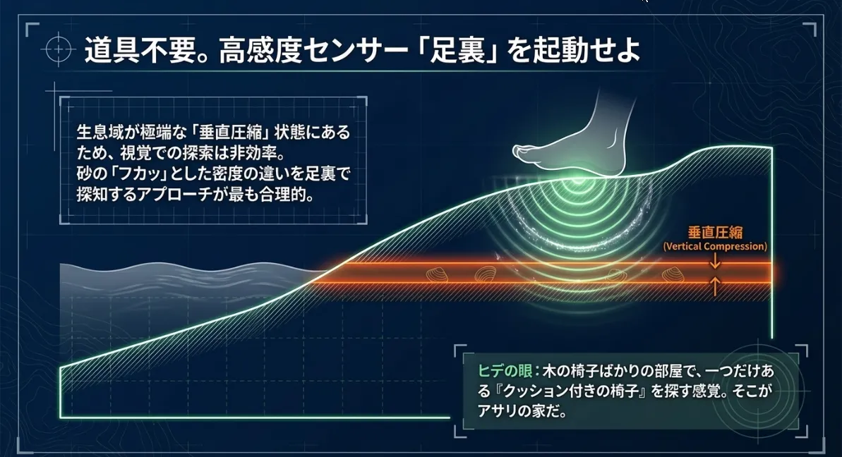 道具に頼らず「アサリの目」と砂の感触で獲物を探す