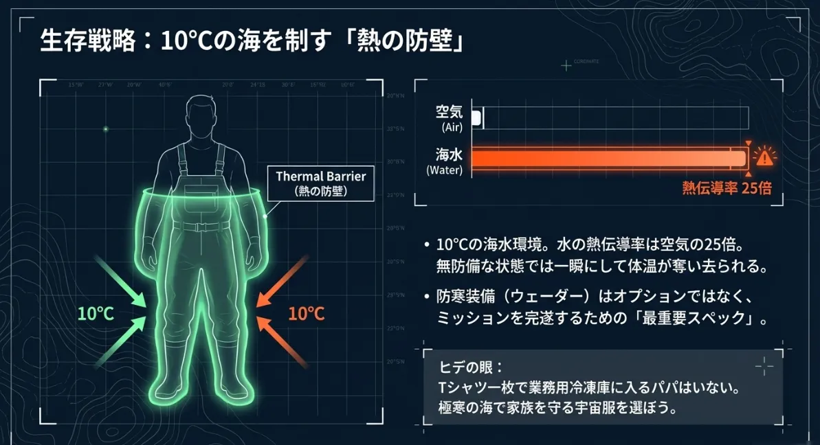 気温に騙されない「水温基準」の防寒ロジックと、快適さを維持するレイヤリング技術を深掘りしています。