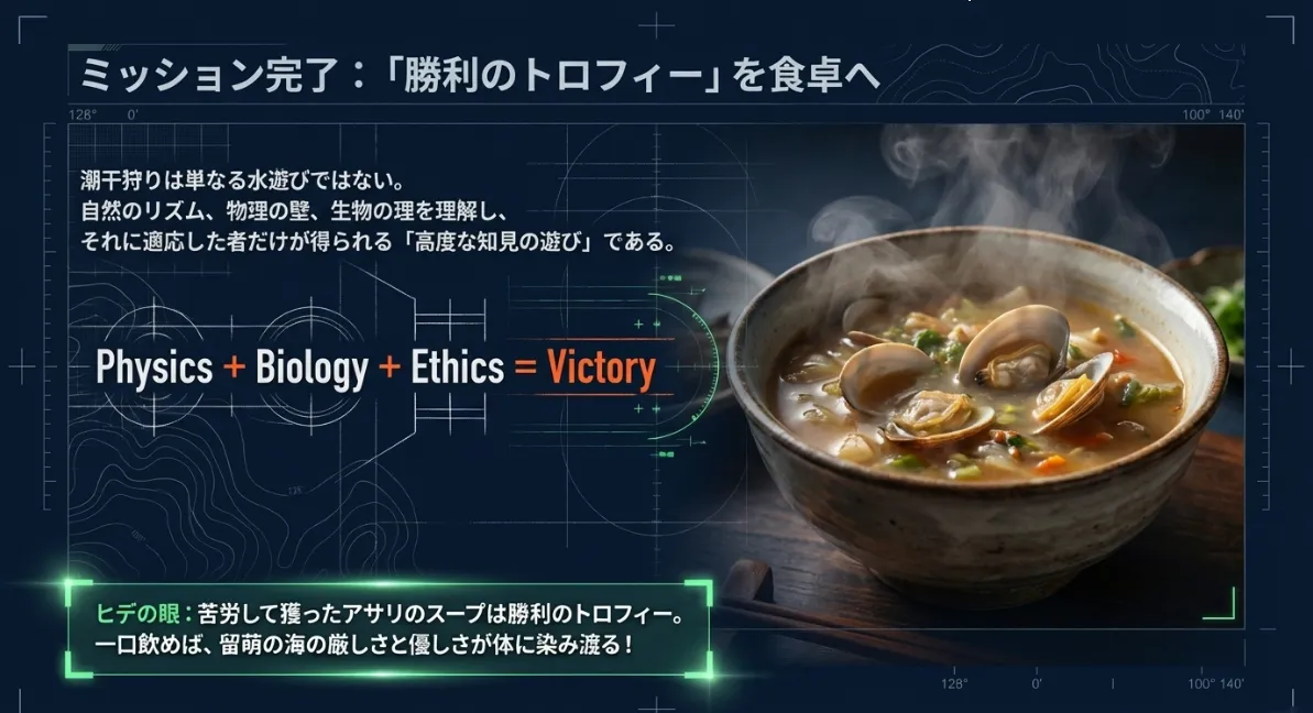 物理法則を知り、自然のリズムに合わせ、ルールを尊重する。そうして得た収穫を家族で囲む食卓は、どんな贅沢よりも豊かな時間になるはずです。もし、現場で低体温の兆候(激しい震えや意識の低下)を感じたら、迷わず海から上がって暖を取ってください。無理をしない勇気も、プロの嗜みですからね。