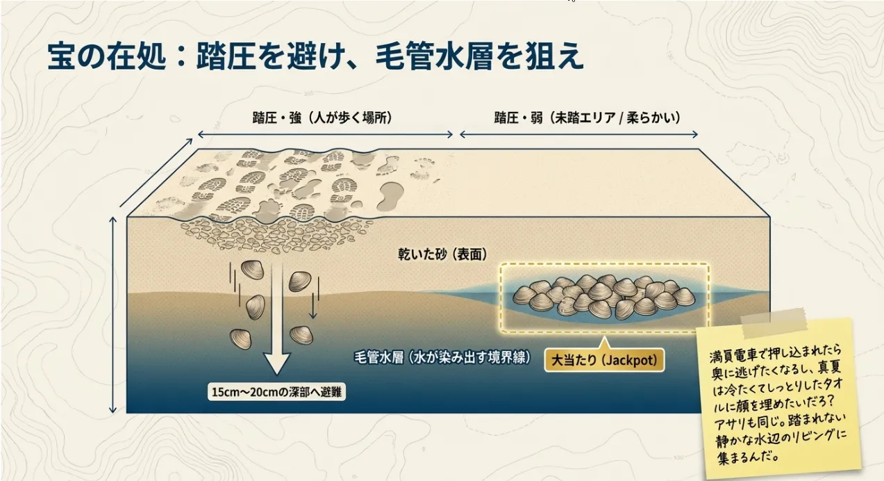 三番瀬は超人気スポット。多くの人が歩く場所では、砂が物理的に圧縮される「圧密(あつみつ)」という現象が起こります。ガチガチに固まった砂の中では、アサリは呼吸がしづらくなり、外敵(人間)から逃れるために通常よりも深い層(15cm〜20cm)まで避難してしまいます。