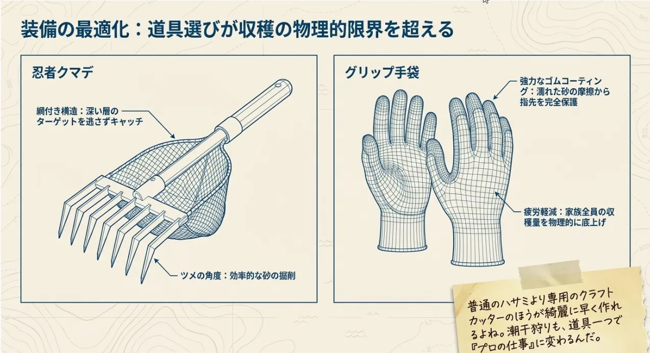 効率よくこの「しっとり層」を攻略するために、道具選びも物理的に考えましょう。三番瀬の人工砂は掘りやすいですが、踏み固められた場所では貝が意外と深い場所に逃げています。そんな時は、少し長めの「忍者クマデ」を使うと、腰への負担を減らしながら美味しいアサリを一網打尽にできます。