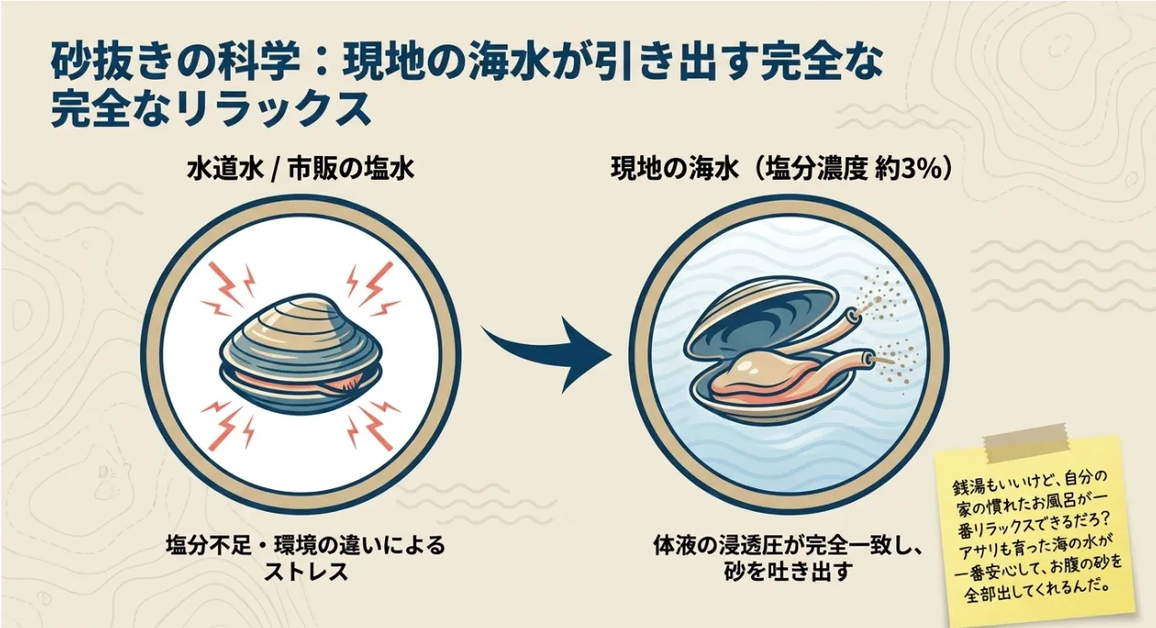 せっかく獲ったアサリを「お店の味」に変えるには、帰宅後の物理的な処理が不可欠です。まず絶対守ってほしいのが、現地の海水をペットボトルで持ち帰ること。アサリは自分が育った水の塩分濃度(約3%〜3.5%)で一番リラックスし、活発に砂を吐き出します。