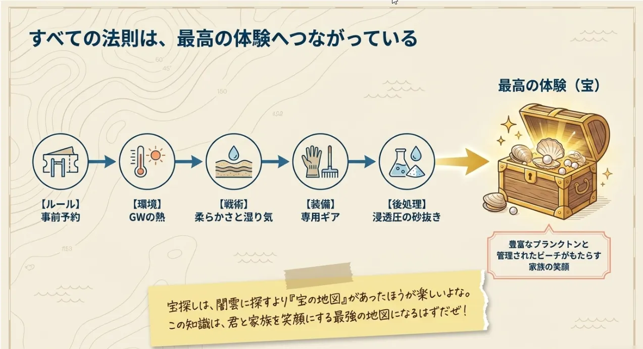 2026年は当日券がありません。現地の物理的な砂の状態を見抜く目を持てば、初心者ファミリーでも確実に大漁を狙えますよ。