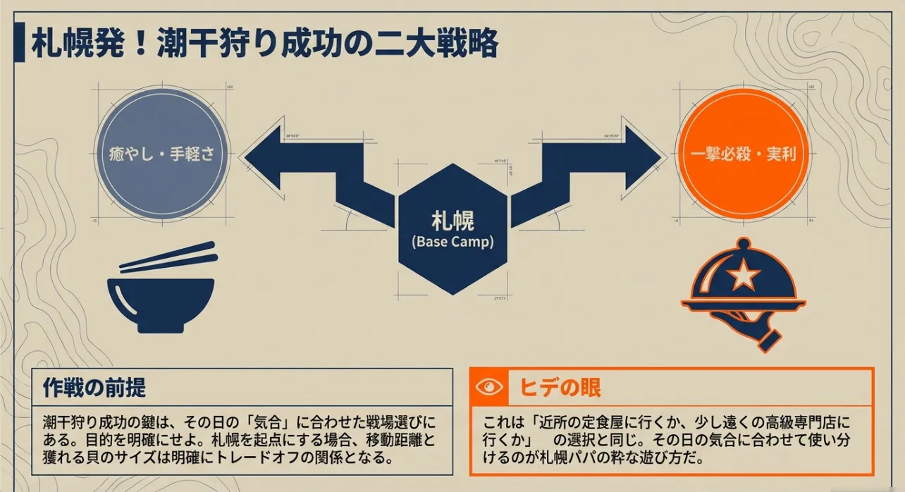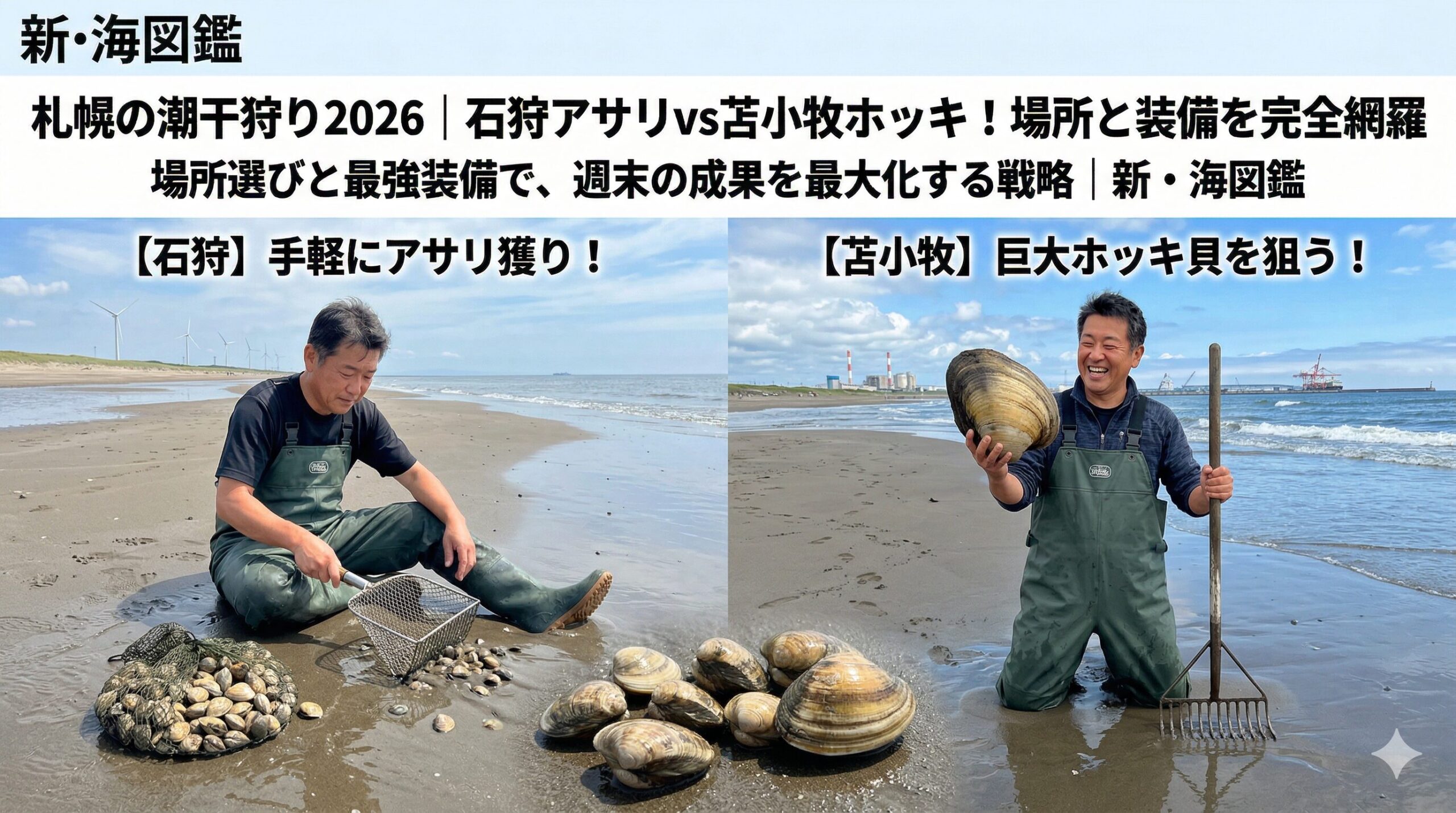 札幌から潮干狩りへ行く際、まず直面するのが「日本海(石狩方面)」か「太平洋(苫小牧方面)」かという選択肢です。札幌には海がありませんが、この2大拠点はどちらも札幌市民にとって馴染み深いフィールド。しかし、獲れる貝の種類も、海までの距離感も全く異なります。まずはその違いを分かりやすく比較表にまとめました。