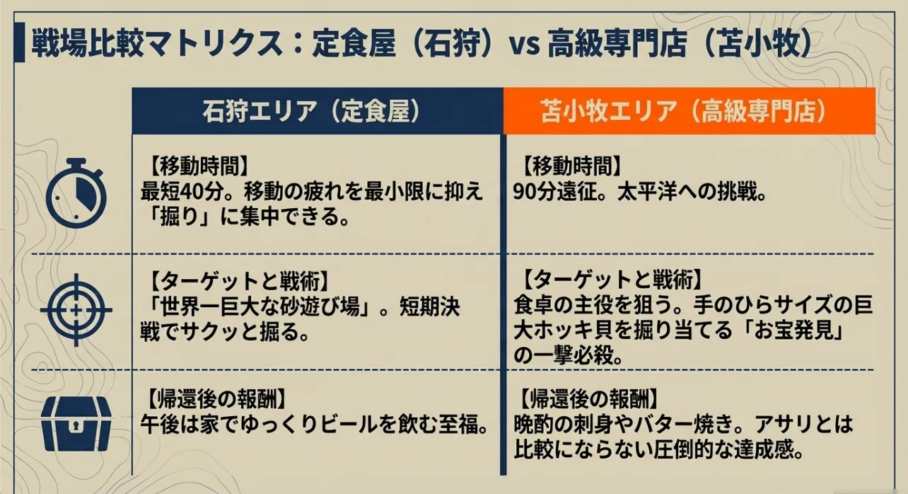 移動の短さと気軽さを取るなら石狩一択ですが、大きなホッキ貝をガッツリ味わいたいなら苫小牧への遠征が正解。その日の気合と目的に合わせて賢く使い分けましょう。