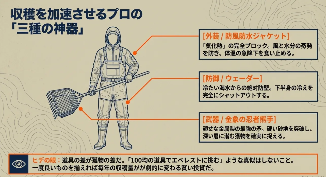 基本は「濡らさないこと」と「風を通さないこと」です。下着、保温着、そして防水・防風のジャケットを重ねる「3レイヤー」を意識しましょう。もし本格的に腰まで浸かって掘りたいなら、チェストハイウェーダーの着用が正解。これがあれば、冷たい海水に直接触れることなく、長時間の作業が可能になります。