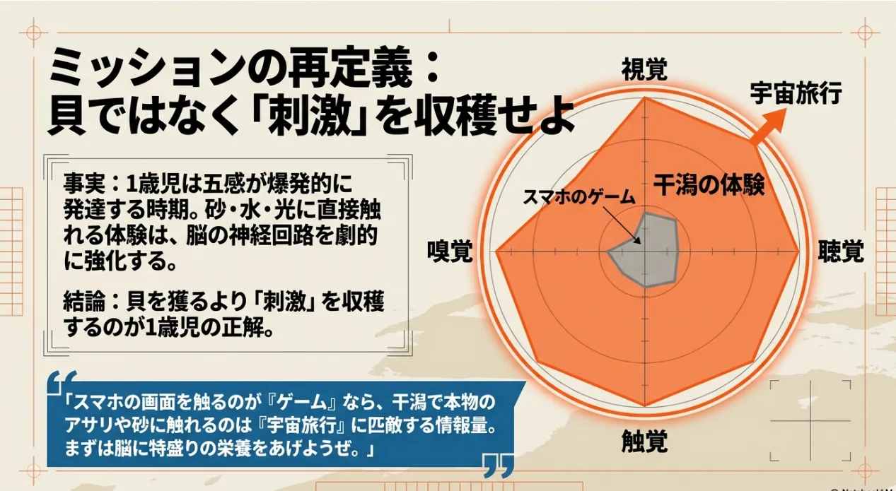 収穫量は0gでOK。広大な干潟を「巨大な感覚教育ラボ」と捉え、徹底した物理防護で安全に遊ばせることがパパの唯一の任務です。