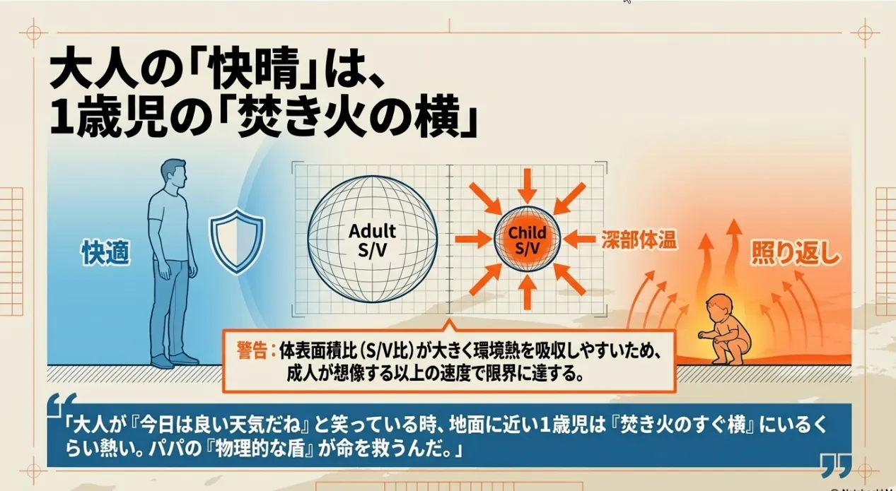 物理的なお話を少しだけすると、1歳児は大人に比べて「体重のわりに皮膚の面積が広い」という特徴があります。これを難しい言葉で「S/V比が大きい」と言いますが、簡単に言うと「周りの熱を吸収しやすく、熱中症になりやすい」ということです。