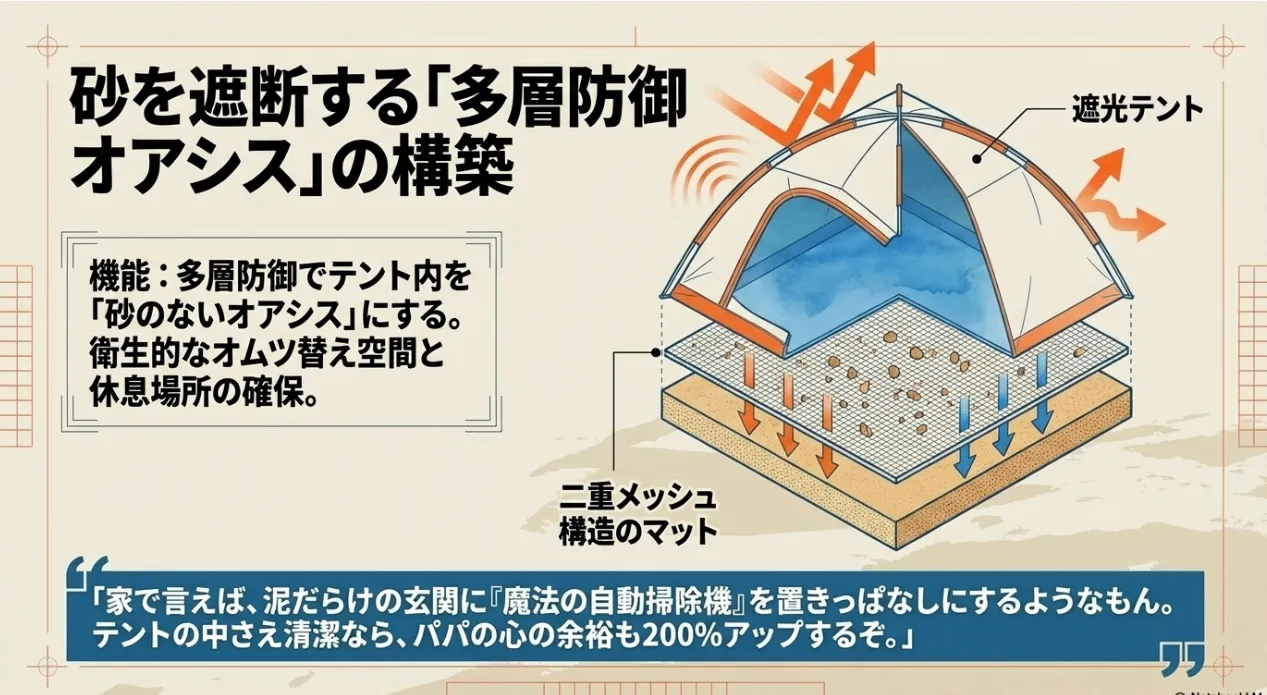 ここでパパに準備してほしいのが、NASAの技術を応用した「砂が下に落ちるマット」です。これを使ってテント内に「クリーンゾーン」を作ることで、現場での快適性が劇的に変わります。