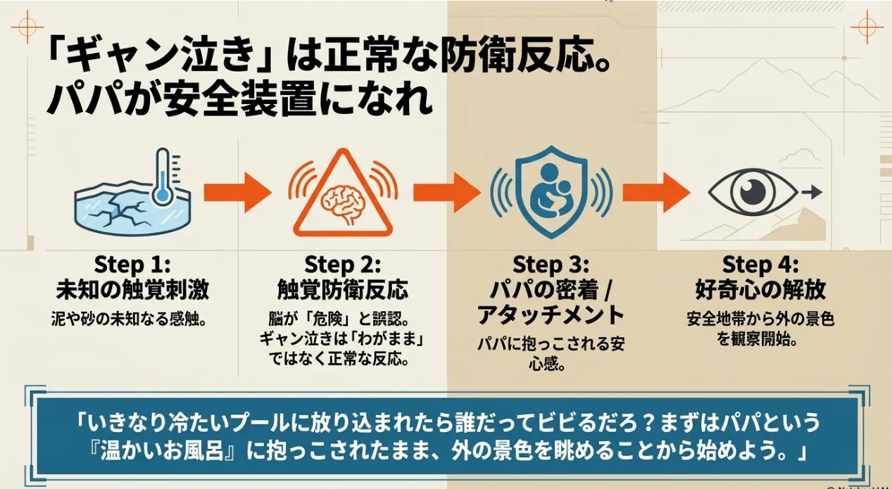 遊びに夢中になっても、ふとした瞬間に不安になってパパの顔を見る。これが「アタッチメント(愛着形成)」のプロセスです。パパが常にそばにいて、目が合った時にニコッと笑ってあげる。その安心感があるからこそ、1歳児は干潟という広大な情報の海を自由に泳ぎ回ることができるんです。