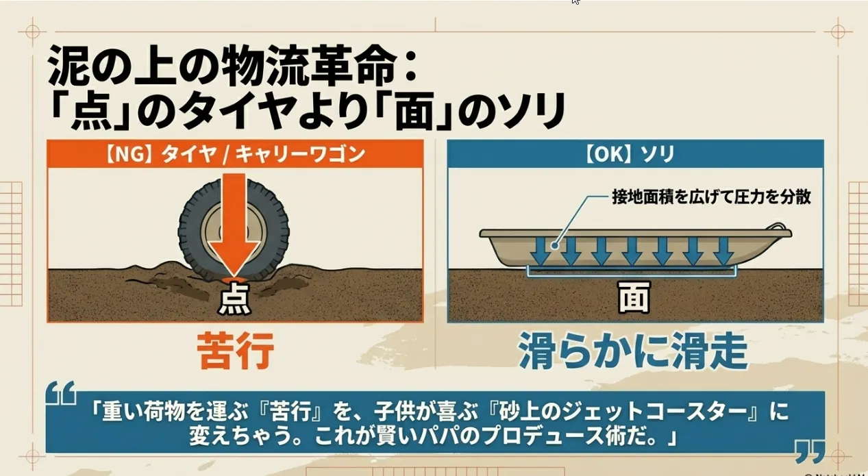 ぬかるんだ干潟で、1歳児を抱っこしながら重い荷物を運ぶのは地獄ですよね。キャリーワゴンも砂にタイヤが埋まって動かなくなることがありますが、ここで役立つのが「雪遊び用のソリ」です。