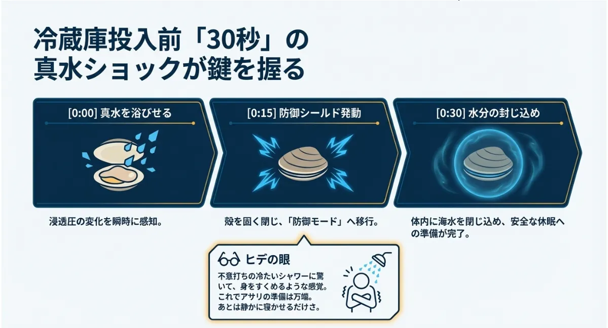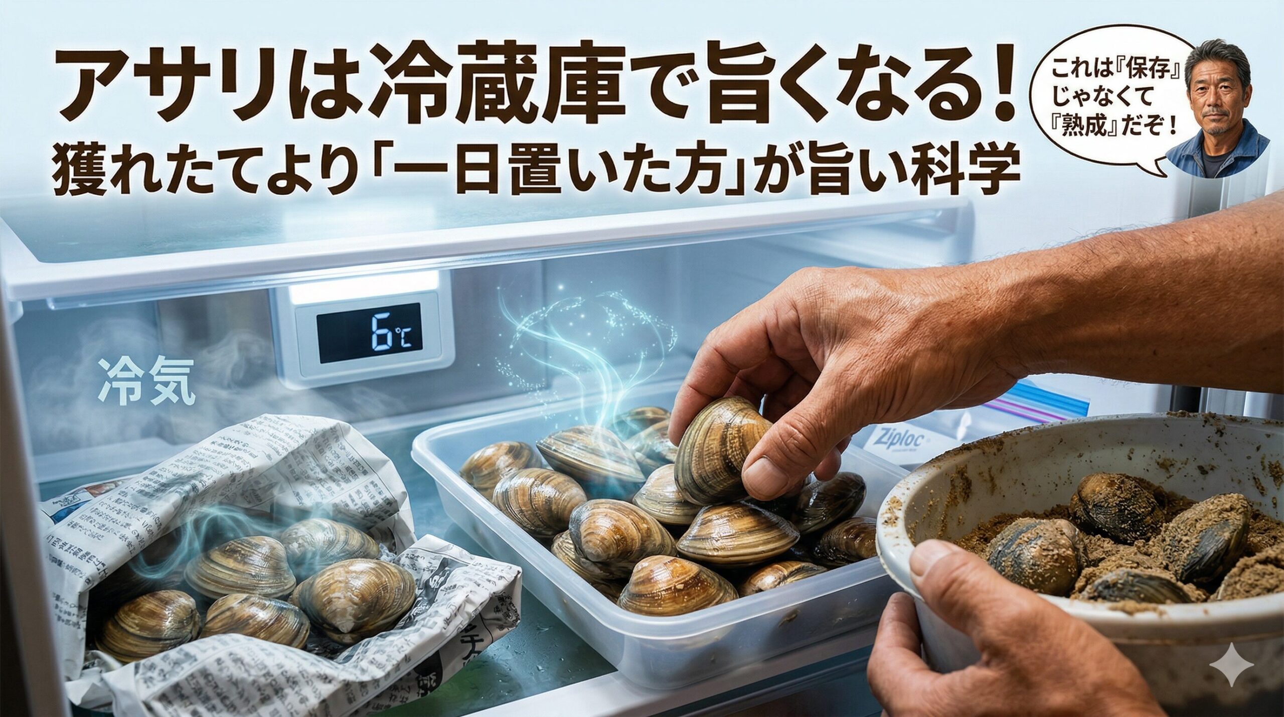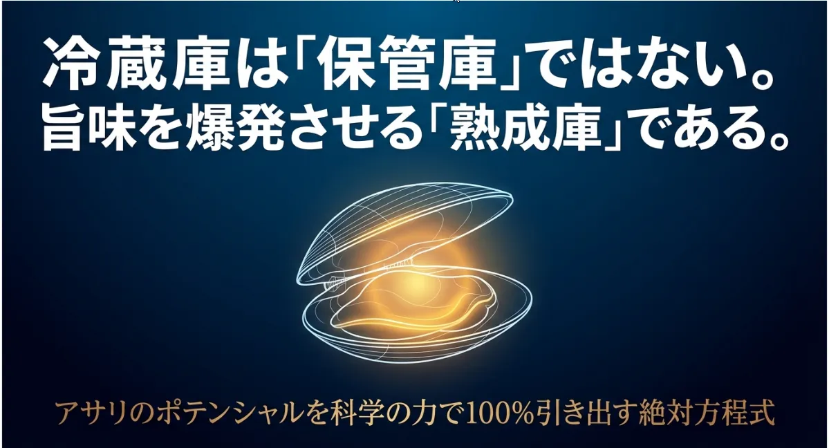 アサリにとって「水がない・寒い」という状況は大きなストレスですが、このストレスこそが旨味の秘訣です。プロの世界ではこれを「嫌気的代謝」と呼びますが、簡単に言えば、アサリが「このピンチを乗り切るぞ!」と細胞をフル回転させることで、僕たちが「美味しい」と感じる成分が凝縮されるわけです。冷蔵庫という変数は、アサリを腐らせることなく、ギリギリの低酸素状態でこの旨味を引き出す「熟成リアクター」として機能しているんですよ。