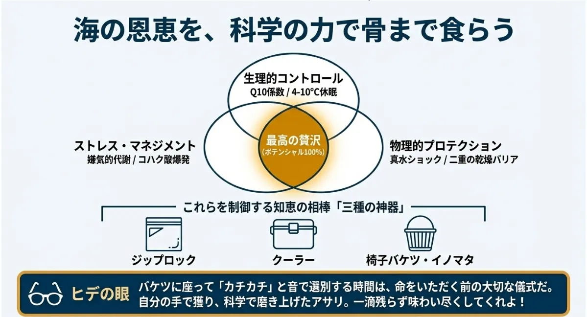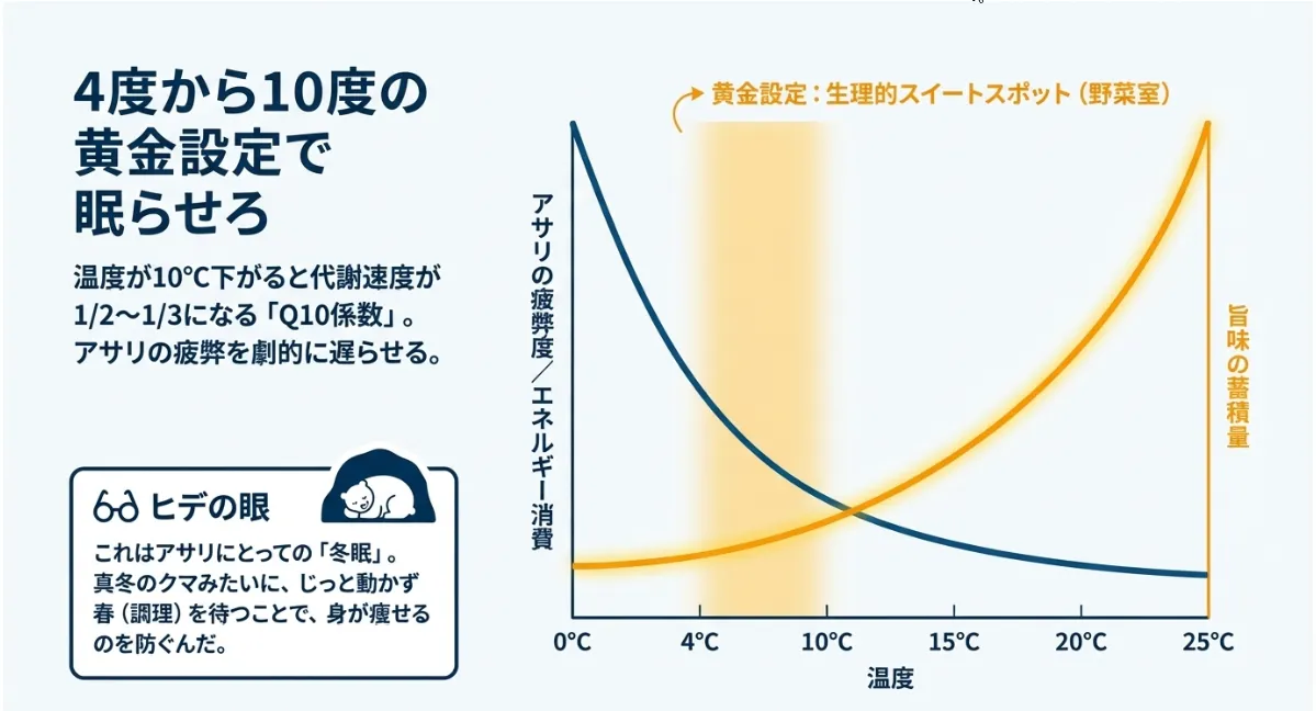 僕たち海のガチ勢にとって、冷蔵庫はただの「冷やす箱」じゃありません。アサリを冬眠させ、細胞の中に旨味をギュッと溜め込ませる「熟成庫」なんです。今回は、4℃から10℃という温度がアサリの体内でどんな魔法をかけるのか、その生化学的な裏側を分かりやすく解説しますね。家族を「お父さんのアサリ、お店より旨い!」と驚かせてみませんか?