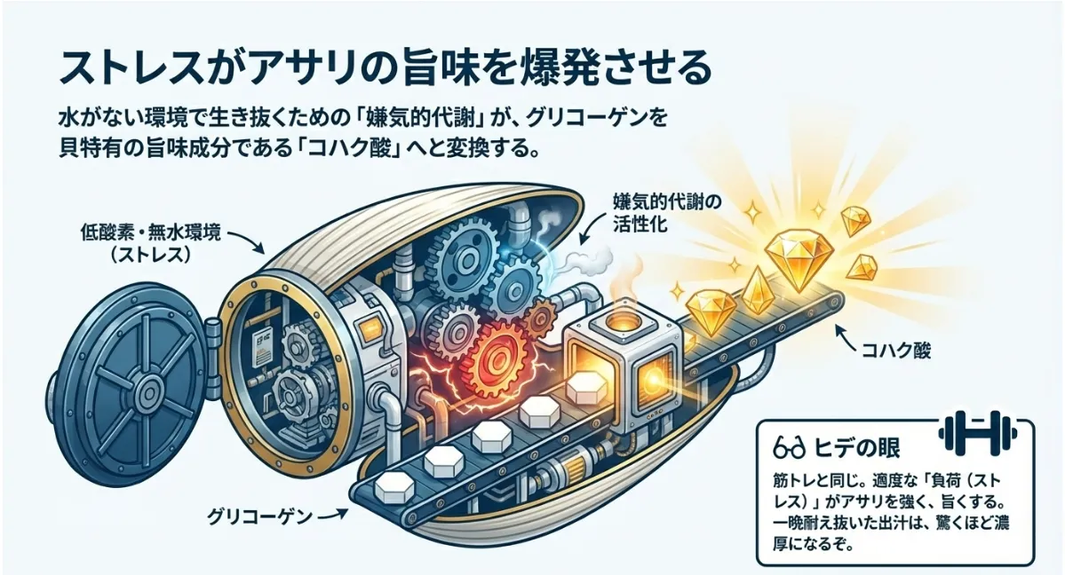 冷蔵庫の中でじっとしているアサリの体内では、実は「美味しさの化学反応」が起きています。水から出されて冷蔵庫に入れられたアサリは、酸素が少ない環境で生き延びるために、自分の体にあるグリコーゲンを燃やして、貝特有の強烈な旨味成分である「コハク酸」を作り出し、細胞の中に溜め込んでいくんです。