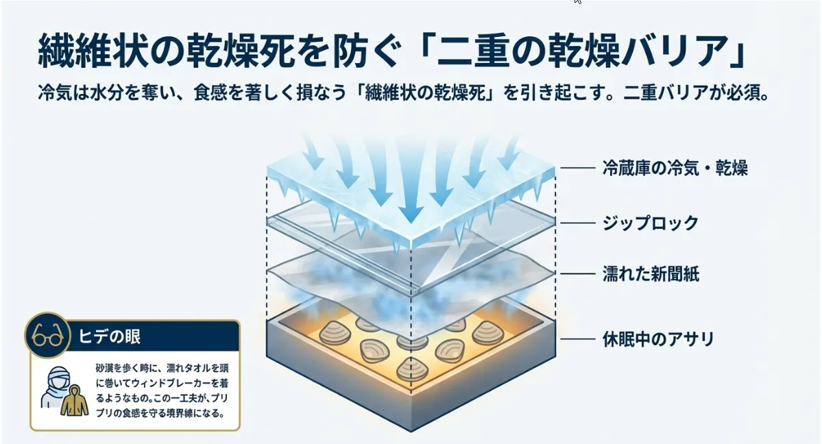 冷蔵庫という環境の最大の弱点は、空気が極度に乾いていることです。アサリをそのまま冷蔵庫に入れるのは、僕たち人間が砂漠に放り出されるようなもの。アサリの生命維持をサポートするには、物理的な「バリア」が必要です。