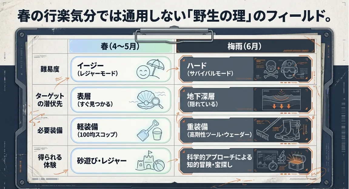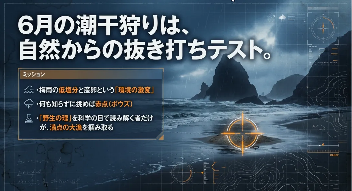 6月の干潟を支配しているのは、ずばり「梅雨」と「産卵」です。この2つの変数が、アサリやハマグリの生態を根底から変えてしまいます。レジャーのテクニック以前に、まずは貝たちの身に何が起きているのかを科学的に覗いてみましょう。