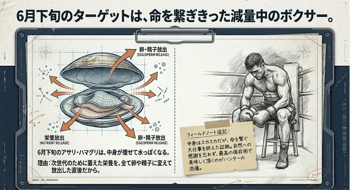 産卵直後の個体は、中身が文字通り「もぬけの殻」状態。放出した空間に水を取り込んでパンパンに見せていますが、火を通すと一気に縮んでゴムのような食感になってしまいます。まさに、ボディービルダーが大会直後にエネルギーを使い果たしてフラフラになっているような状態ですね。この時期に美味しい貝を見つけるには、産卵の波を避けるか、まだ体力を残している個体を探す戦略が必要になります。