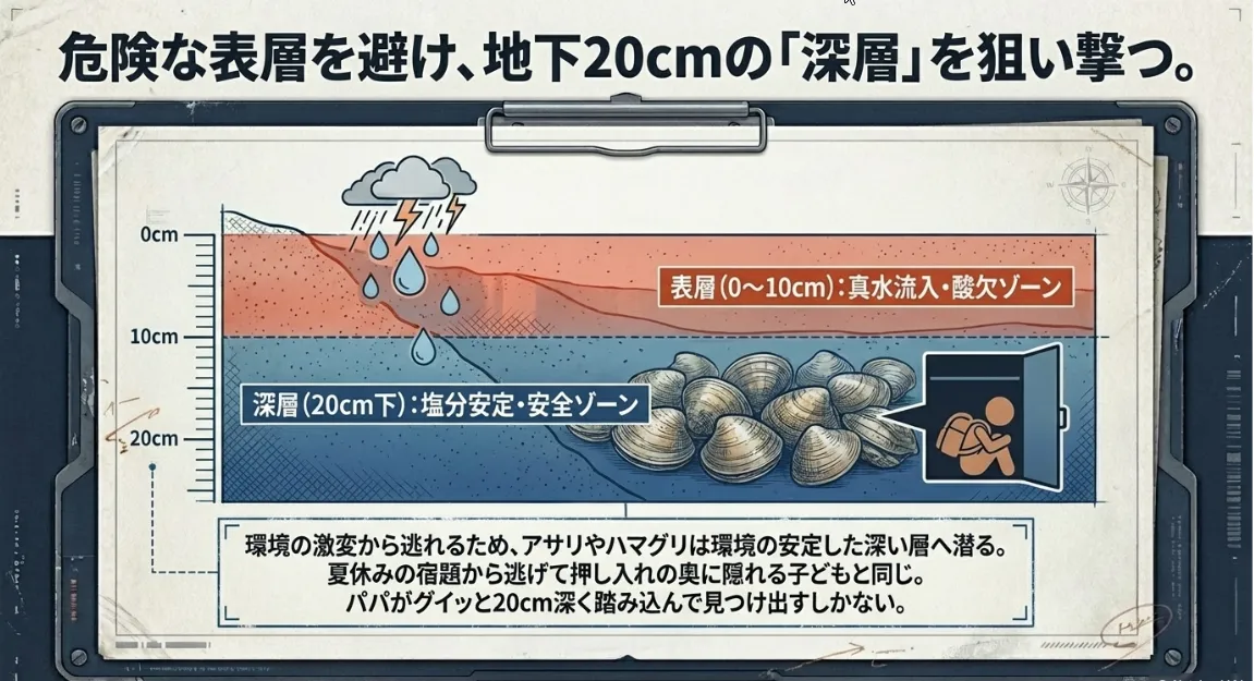 貝たちは、この「息苦しい表層」や、大雨の影響を受けやすい表面を嫌い、より環境が安定している「深層(深いところ)」へと潜り込みます。アサリなら10〜15cm、ハマグリにいたっては20cm以上の深さに潜っていることも珍しくありません。6月に「取れない」と言っている人の多くは、春と同じように表面の5cm程度しか掘っていないんです。この時期は、腕が疲れるのを覚悟で「深く」攻めるのが勝利の鉄則ですよ。