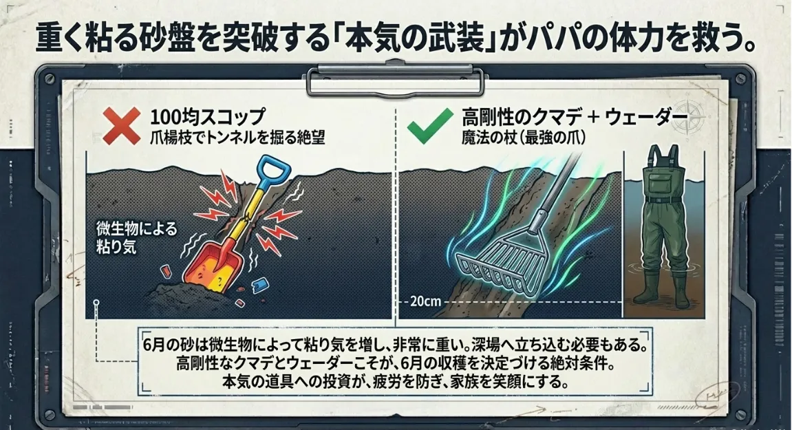 ただし、6月の砂は泥が混じって非常に重いです。安価なレジャー用クマデでは、深く差し込んだ瞬間にポキッと折れてしまうこともあります。僕も昔、無理に深く掘ろうとしてクマデを壊し、家族の前で格好悪い思いをしたことがあります。6月の深掘りには、重い砂の抵抗に負けない「剛性」と、深い層まで届く「爪の長さ」が絶対条件ですよ。