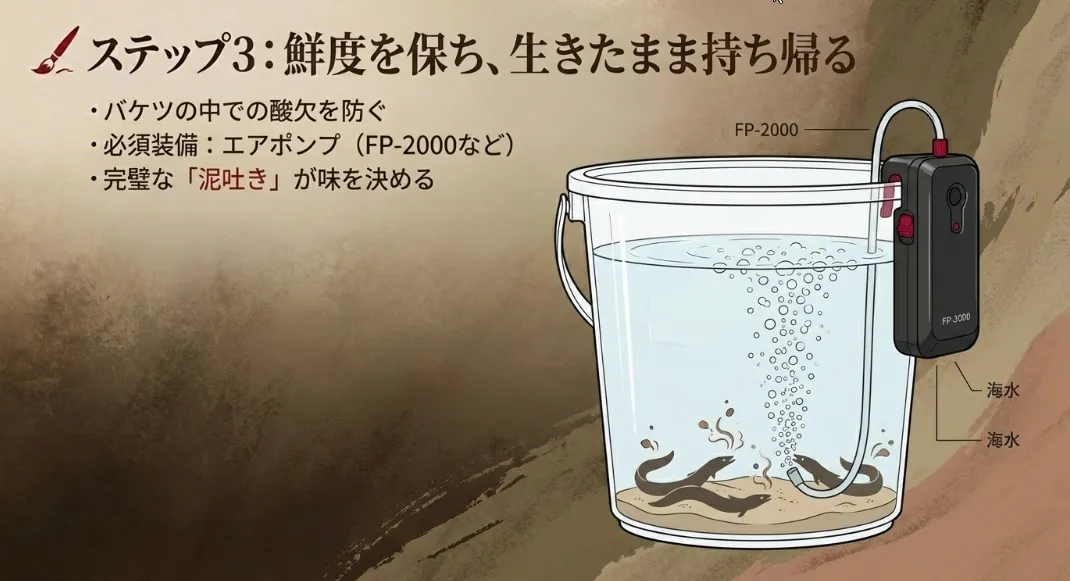 獲った後の楽しみといえば、なんと言っても天ぷらですよね。アナジャコは二枚貝よりも酸素をたくさん必要とする生き物です。バケツに入れておくだけではすぐに弱ってしまい、味が落ちてしまいます。生きたまま持ち帰って泥をしっかり吐かせるために、強力なエアーポンプは必須アイテムと言えます。