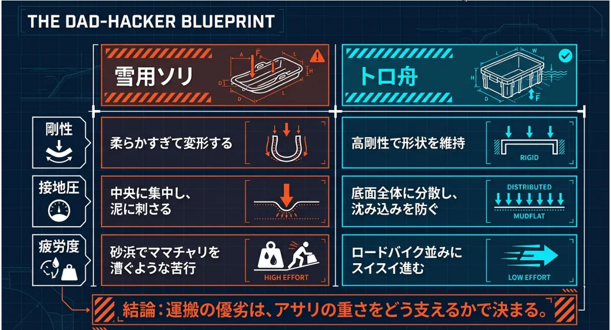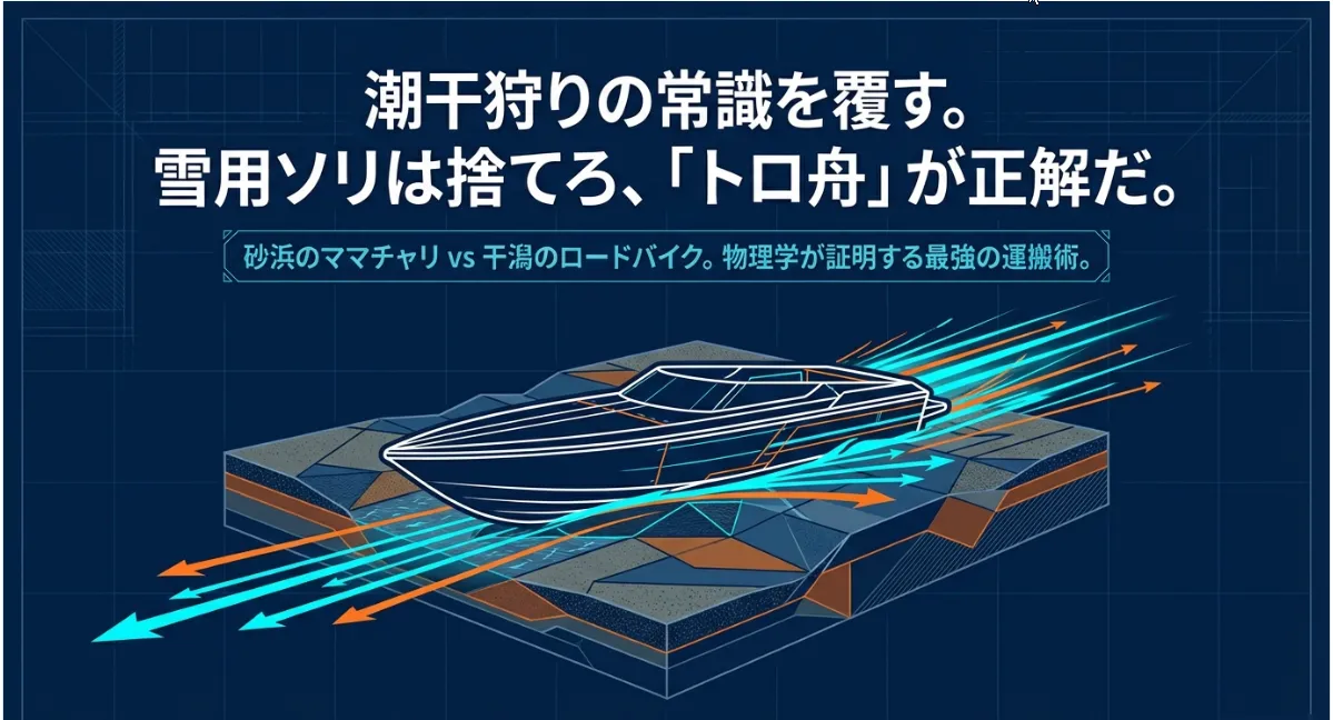 雪用ソリのたわみに悩まされる日々は、今日で終わりです。トロ舟という剛性体に収穫物を載せ、疎水性の高い底面で泥を切り裂く快感を、ぜひ次の干潮時に味わってみてください。重いはずの荷物が嘘のように付いてくるその瞬間、あなたは干潟で最もスマートに動く「知的なサバイバー」になっているはずです。