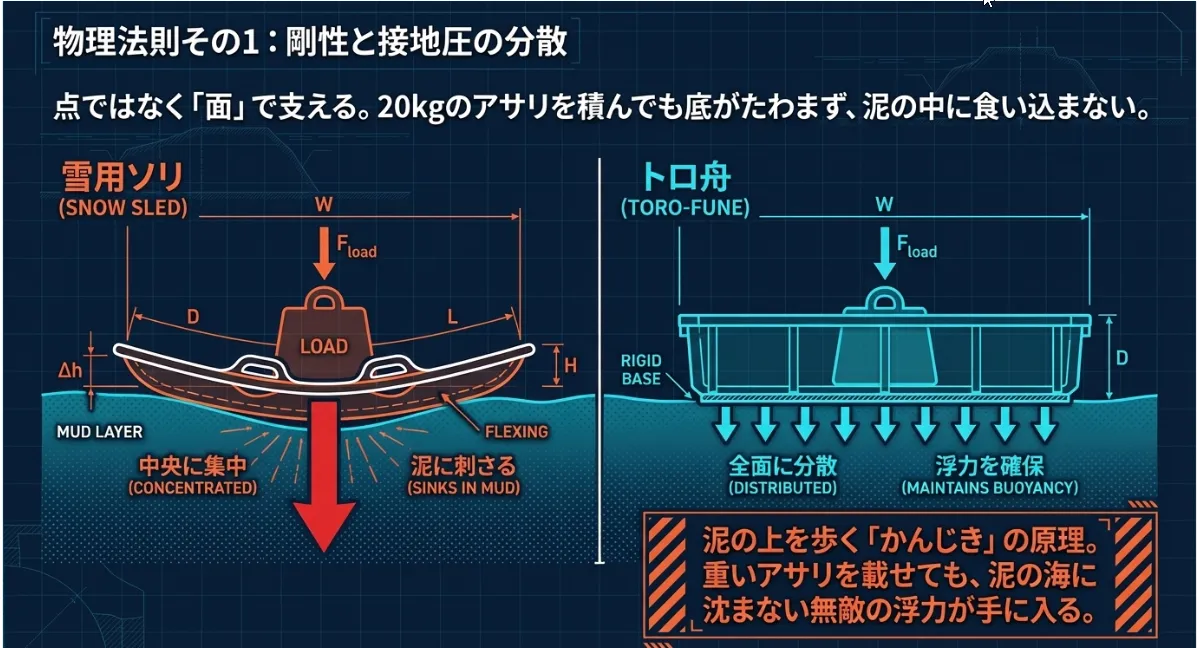 トロ舟が雪用ソリより軽く感じる最大の理由は、その「硬さ(剛性)」にあります。泥の上を移動するとき、大切なのは「いかに沈み込まないか」です。沈み込む深さを決めるのは、重さそのものよりも、地面にかかる「接地圧(単位面積あたりの重さ)」なんですね。