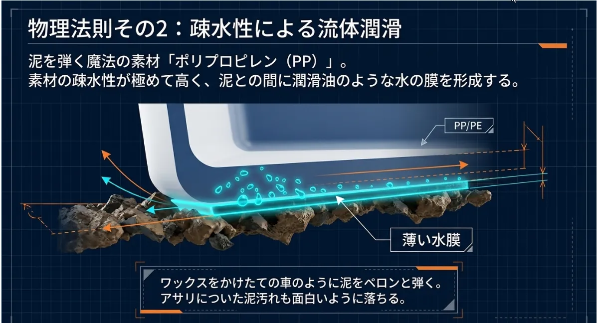 PPやPEの表面は、まるでワックスをかけた後の車のように水を弾きます。潮干狩りの泥にはたくさんの水分が含まれていますが、トロ舟の底面はこの水分を弾くことで、底と泥の間に薄い「水の膜」を作り出します。これが潤滑油の役割を果たし、摩擦を劇的に減らしてくれるんです。これを専門的には「流体潤滑」と呼びますが、感覚としては「泥の上が氷の上のようになる」イメージです。