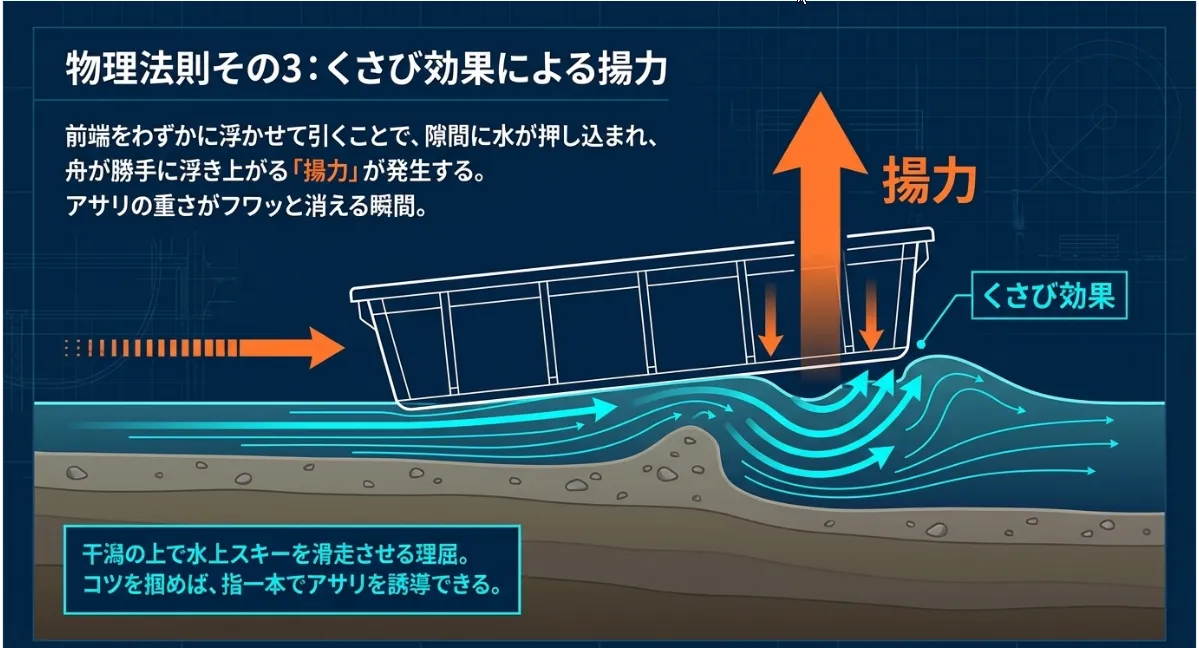 トロ舟を引くときは、ロープを少し短めに持ち、前端を数センチだけ浮かせるように意識してみてください。こうすることで、底面と泥の間に「くさび状」の隙間が生まれます。移動する勢いでこの隙間に泥の中の水分が押し込まれ、強力な「動圧」が発生して舟を持ち上げてくれるんです。これは水上スキーが水の上を滑るのと同じ理屈。泥に食い込ませず、水膜の上に乗せるのがプロの技です。