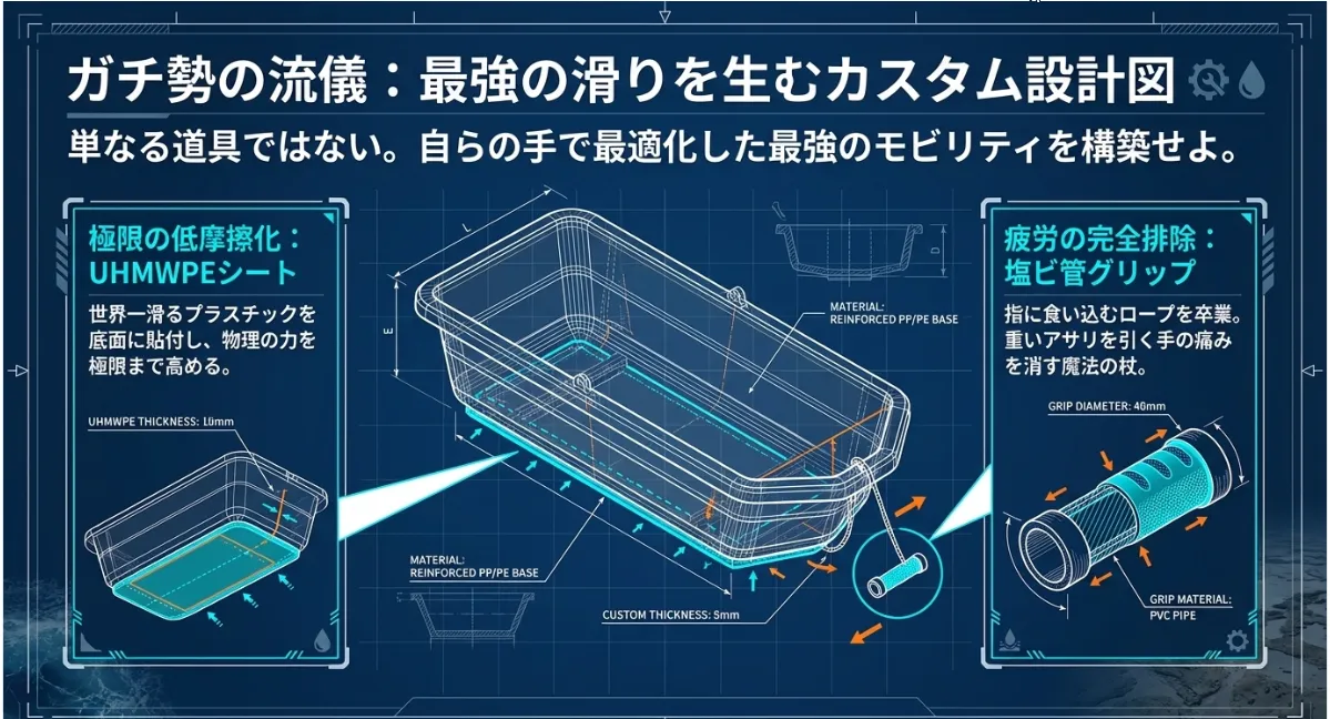 トロ舟の底に「超高分子量ポリエチレン(UHMWPE)」というシートを貼ってみてください。これは工業用の機械などにも使われる「世界で最も滑るプラスチック」の一つ。砂利混じりの過酷な干潟でも傷がつきにくく、泥との摩擦係数を極限まで下げてくれます。一度貼ってしまえば、どんなに重い獲物を積んでも、指一本でスルスルと付いてくる感覚に感動するはずです。