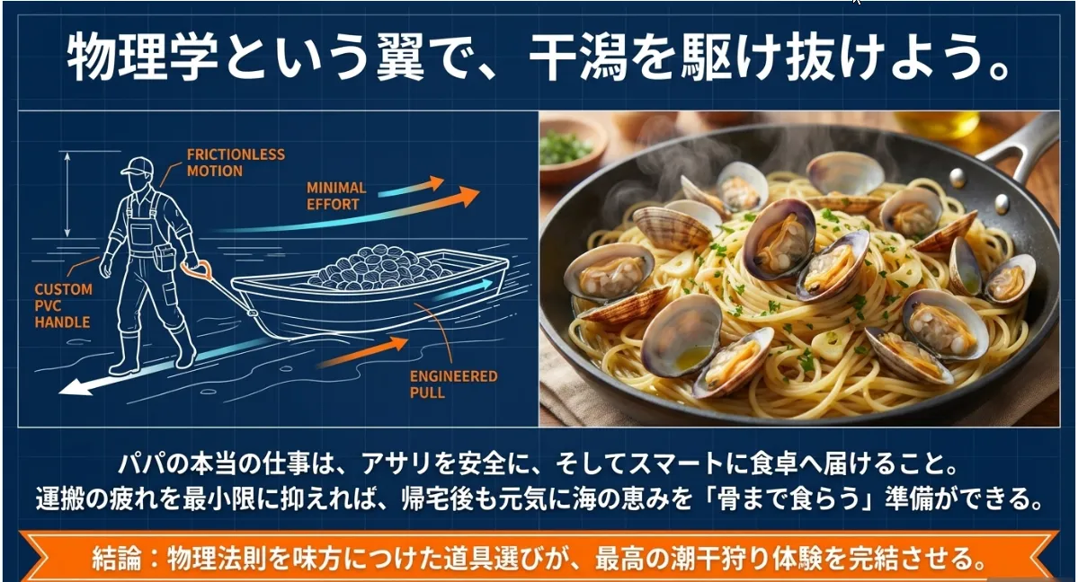 潮干狩りにおける重量物の運搬は、もはや「耐える苦行」ではありません。適切な代用材料を選び、流体潤滑や接地圧の分散といった物理法則を味方につけることで、それは科学的に制御された「効率的な滑走プロセス」へと進化します。