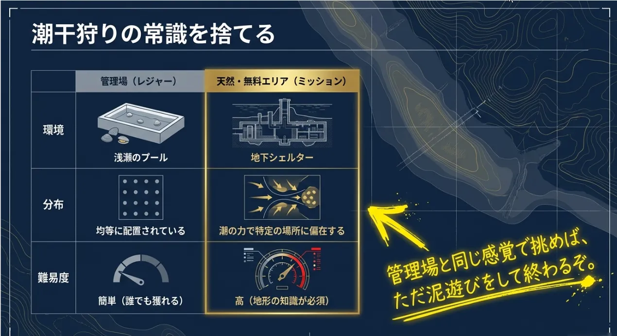 潮干狩りを計画するとき、多くの人が「確実に獲れる木更津(有料・撒き貝)」と、今回紹介している「天然の袖ヶ浦(無料)」で迷うはずです。海のプロとしての僕の結論はシンプル。「レジャーとしての安心感」を買うか、「天然物という最高のご褒美」を自力で掴みに行くかの二択です。