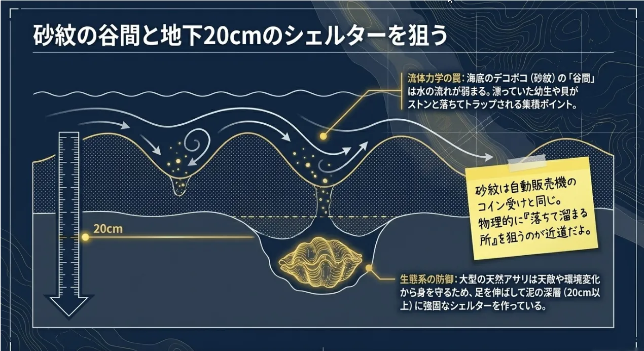 潮が満ち引きするとき、砂紋の「盛り上がった部分(山)」は流れが速く、逆に「凹んだ部分(谷)」は流れがフワッと弱まります。この弱まった場所がトラップ(罠)となって、潮に乗って漂っていたアサリの赤ちゃんがストンと落ちて定着するんです。つまり、砂紋に対して垂直に掘るのではなく、砂紋の「谷」に沿って横長に掘る。これだけで、ヒット率は劇的に変わります。