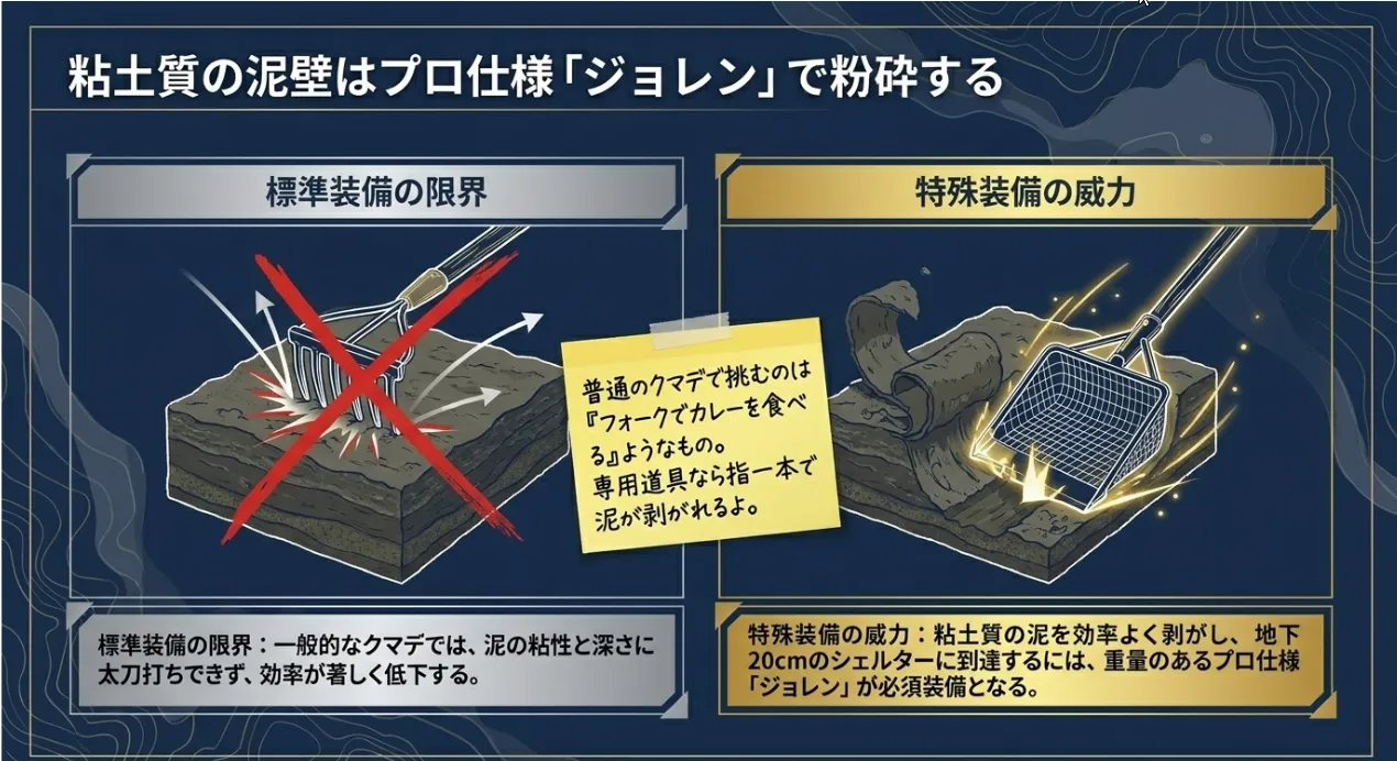 天敵から身を守る天然アサリは、想像以上に深く潜っています。一般的なクマデでは届かない「20cmの壁」を、重量のあるジョレンで剥がすように掘る。これが無料エリアでボウズ(収穫ゼロ)を避ける核心技術です。