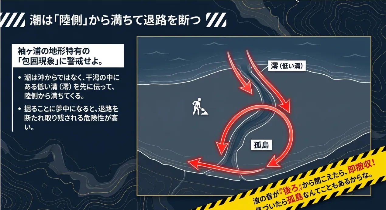 これが一番怖い。袖ヶ浦の干潟は、沖から波が来る前に、自分より「陸側」にある低い溝(澪)から先に水が満ちてくることがあります。気づいた時には深い水路に阻まれて戻れなくなる「取り残され事故」が実際に起きています。足元に水が来たら遅いと思ってください。背後の地形を常に意識し、余裕を持って撤収するのがプロの鉄則です。